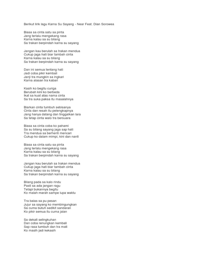 Lihat lirik lagu su sayang versi indonesia Versi teks yang digunakan adalah versi near. Lirik Lagu Karna Su Sayang Near dan Dian Sorowea Versi Bahasa Indonesia Youtuber Kery Astina menyanyikan lagu Karna Su Sayang Neat ft. Beberapa bagian lirik mungkin mengalami perubahan untuk menyesuaikan dengan makna lagu. Baca juga:sayang dan lirik lagu su sayang versi indonesia Lirik Lagu Karna Su Sayang Versi Bahasa Indonesia biasa ku cinta satu ku pinta jangan terlalu mengekang rasa karena kalau telah ku bilang ku takkan berpindah karena ku sayang.
